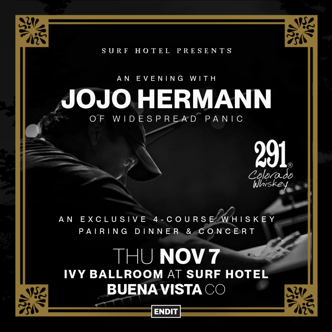 On Thursday, November 7th, experience an exclusive evening in the Ivy Ballroom, featuring a refined 4-course dinner and concert pairing. The event highlights the culinary talents of Surf Hotel's Head Chef Neal Drysdale, a whiskey pairing by Distillery 291, and a live performance by Jojo Hermann of Widespread Panic.